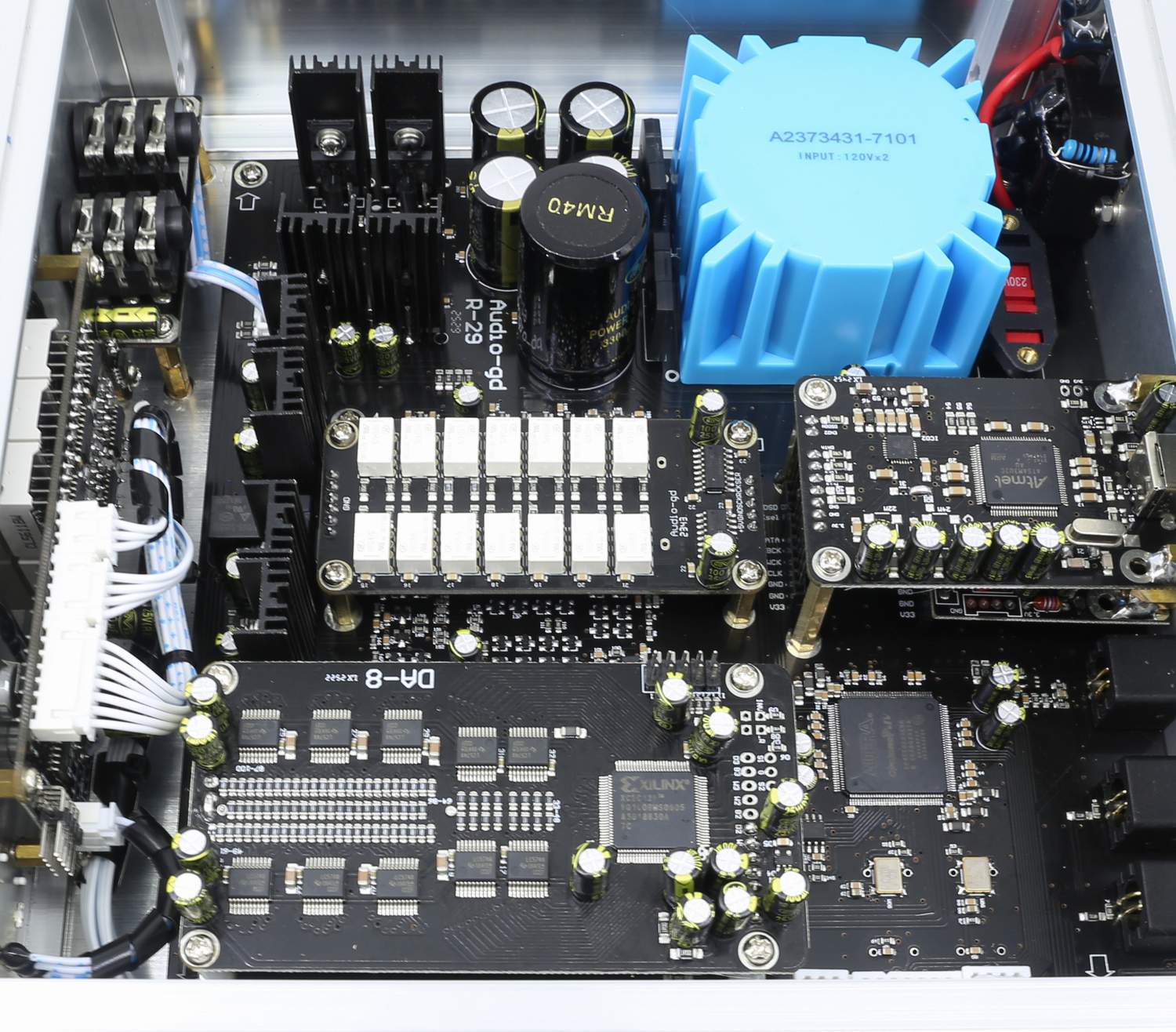 В основе — полностью дискретные R-2R декодеры (4 группы для PCM) + 2 группы настоящих нативных DSD-декодеров, FPGA-процессор для параллельной обработки данных (параллельный режим вместо последовательного — меньше влияния джиттера, выше прозрачность и детальность). Поддержка PCM до 32 бит/384 кГц и DSD512 (Native). USB на базе Amanero 384 с асинхронной передачей и изоляцией.