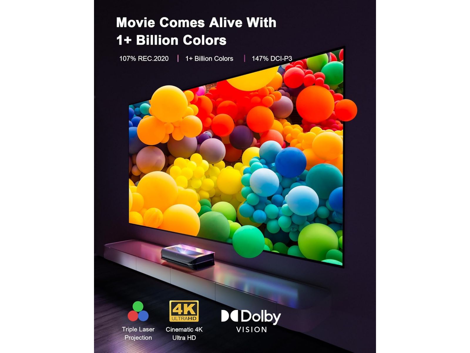 В основе — чистый RGB triple-laser без цветового колеса (Tri-Chroma), обеспечивающий яркость 2000 ISO люмен (до 3000 пиковых), охват 107% BT.2020, контрастность 2500:1 (с технологией Enhanced Adaptive Black Level) и поддержку Dolby Vision, HDR10+, HDR10, HLG, а также Active 3D. Изображение насыщенное, с естественными цветами, глубоким чёрным и отличной детализацией на экранах до 150 дюймов — проектор устанавливается всего в нескольких сантиметрах от стены (коэффициент проекции 0.25:1).