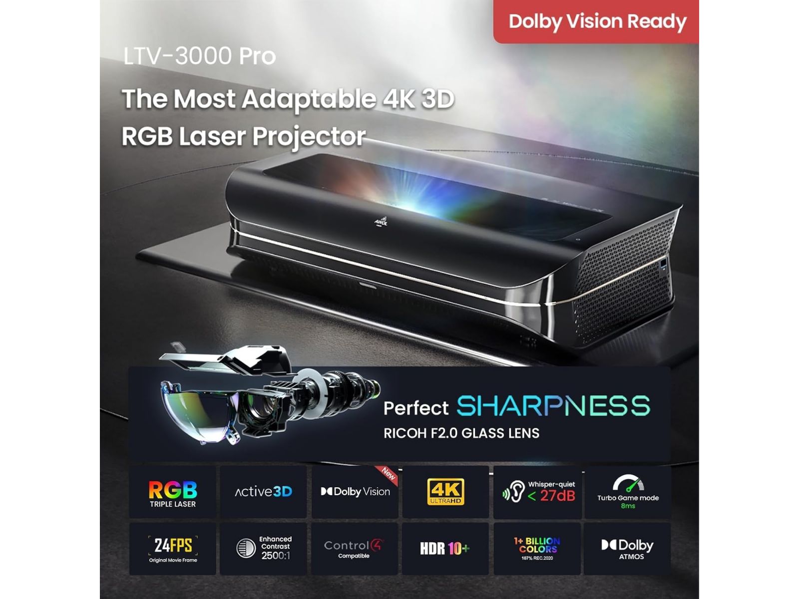 AWOL Vision LTV-3000 Pro — ультракороткофокусный 4K лазерный проектор с RGB triple-laser источником света от бренда AWOL Vision. Это средняя модель в премиальной линейке, предлагающая баланс яркости, цвета и функциональности для домашнего кинотеатра в гостиной с умеренным освещением, стриминга, гейминга и активного 3D.