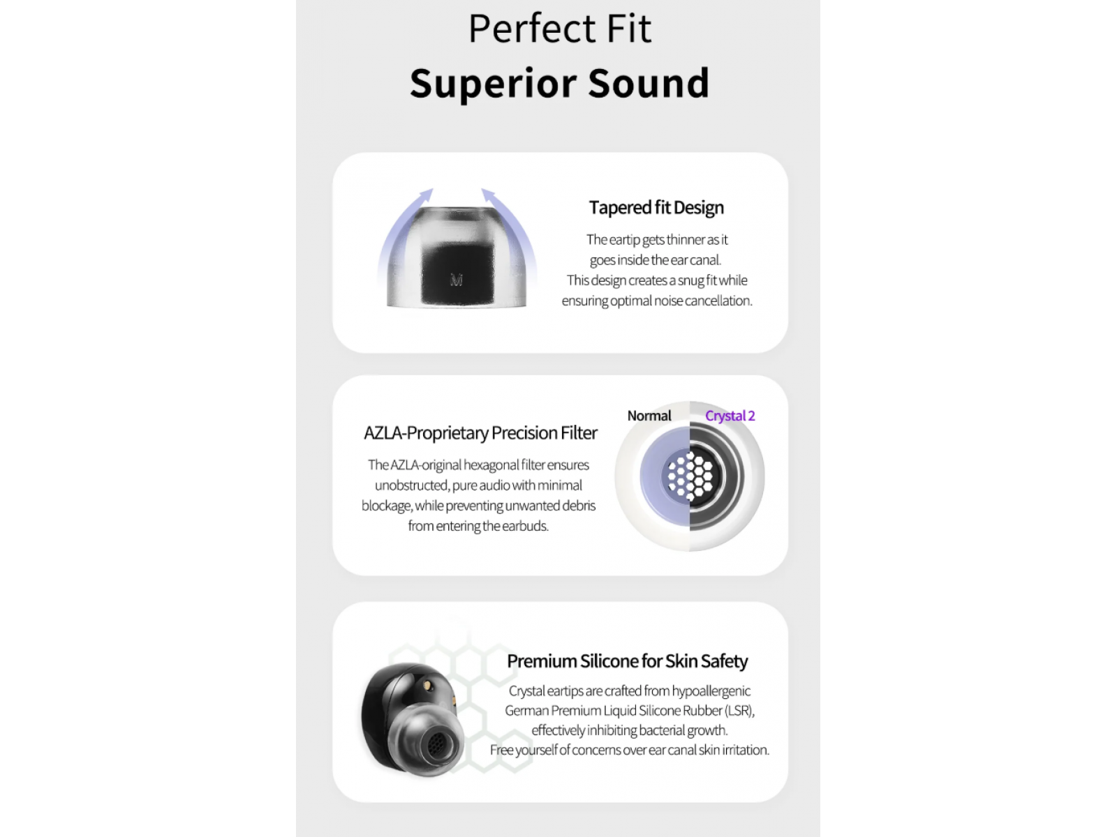 Изготовленные из гипоаллергенного немецкого жидкого силиконового каучука (LSR), амбушюры Crystal 2 препятствуют размножению бактерий и защищают ушной канал. Наслаждайтесь прослушиванием без лишних хлопот и раздражения.