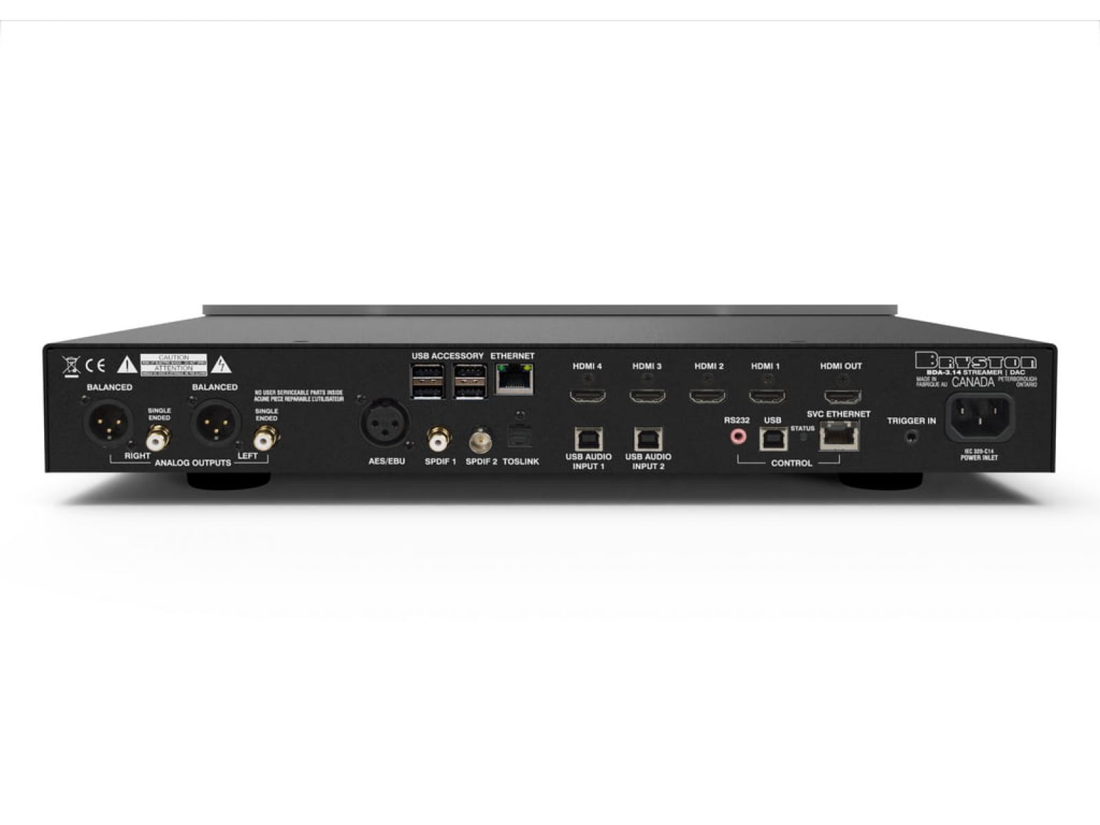 Управление цифровым соединением между внутренним музыкальным проигрывателем и ЦАП осуществляется по протоколу I²S, стандартному интерфейсу премиум-класса, который используется для соединения цифровых аудиоустройств, сохраняя аудиоданные и коды синхронизации практически без ошибок. BDA-3.14 также имеет цифровой регулятор громкости, позволяющий пользователям напрямую управлять усилителем мощности. Обновленная версия пользовательского интерфейса Bryston Manic Moose для телефонов, планшетов и компьютеров обеспечивает пользователям интуитивно понятный контроль над всеми функциями аппарата. Особняком стоят HDMI-входы и выходы (4/1)