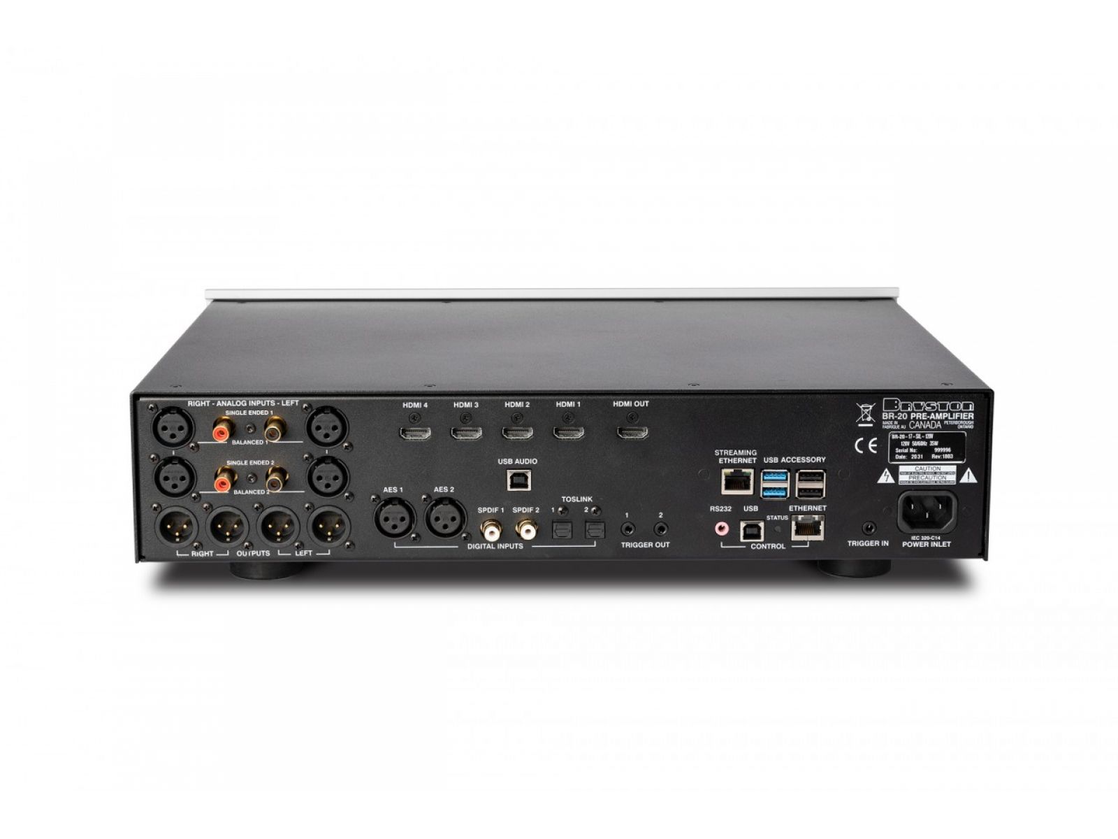 Предварительный усилитель Bryston BR-20 спроектирован в полностью балансной концепции. Здесь реализовано независимое питание аналоговой и цифровой части. Цифровая подсистема включает сетевой стример и ЦАП, причем, модель готова работать как с сетевыми хранилищами в домашней сети, так и с популярными стриминговыми lossless сервисами типа Tidal и Qobuz. Блок ЦАП может обрабатывать потоки PCM с параметрами вплоть до 24 бит / 384 кГц, а также DSD до DSD256. Кроме того, Bryston BR-20 умеет получать контент DSD через HDMI, для чего необходимо будет приобрести опциональную плату с четырьмя портами HDMI.