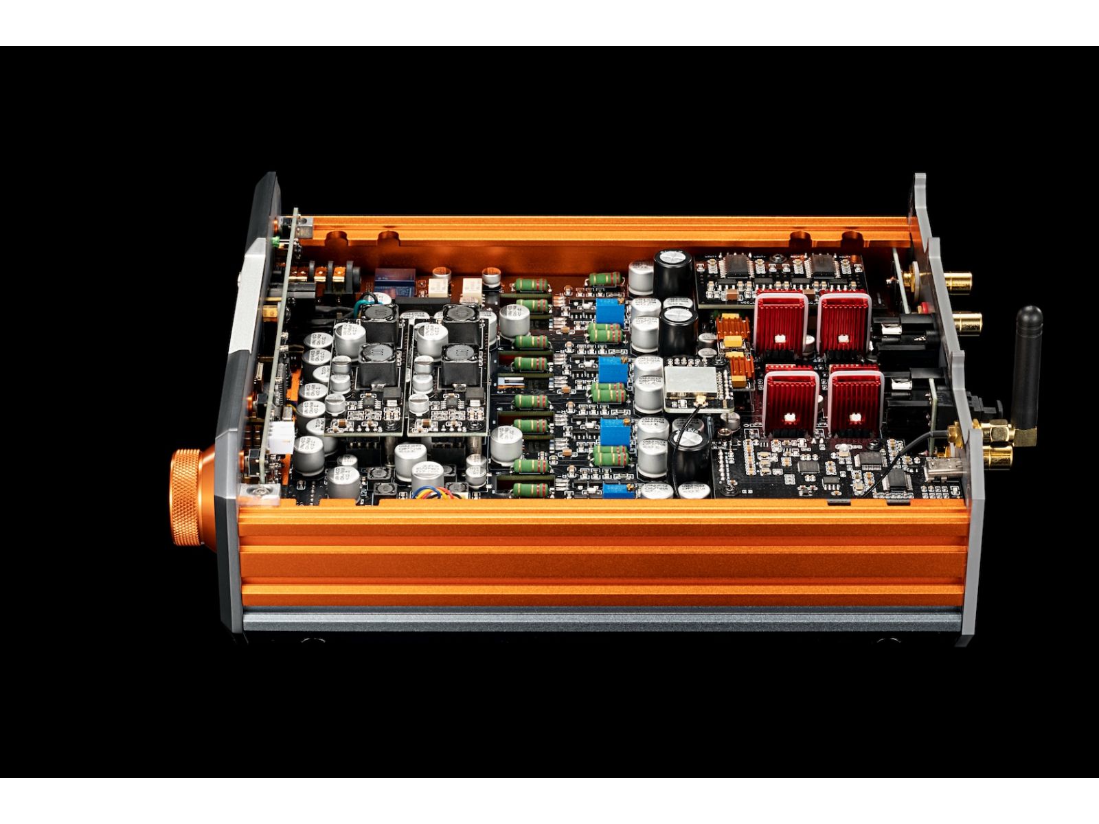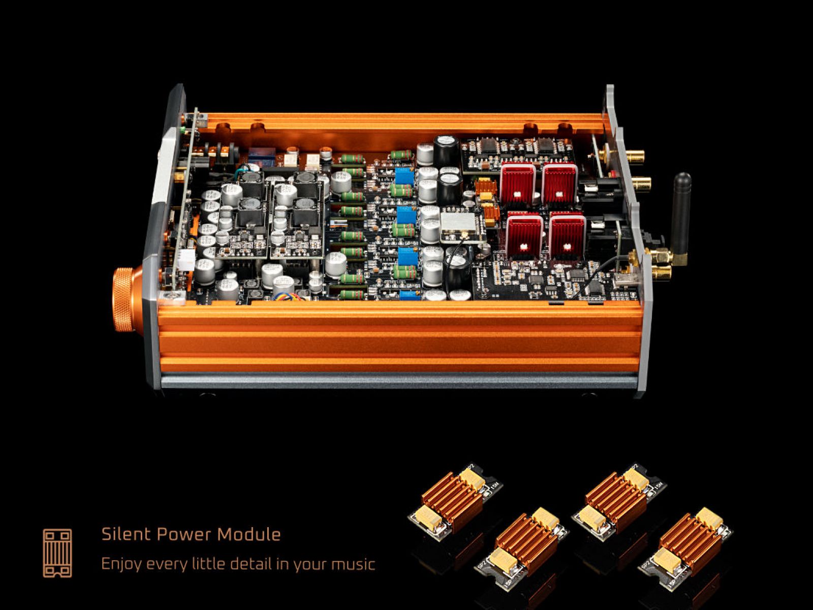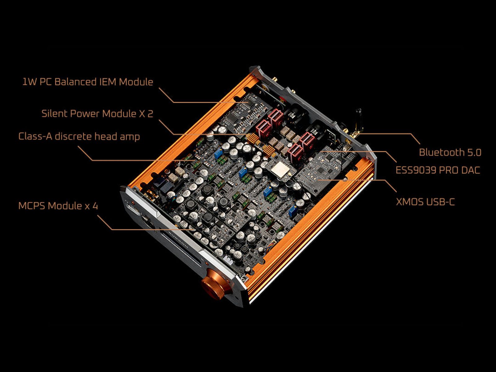 В сердце устройства — двойные чипы ESS9039PRO DAC, обеспечивающие сверхвысокое разрешение, минимальные искажения и детальность. Полностью дискретный аналоговый тракт с фирменными модулями Silent Power (двойные для сверхчистого питания) и MCPS (четыре модуля) гарантирует чёрный фон и стабильность. Усилитель класса A выдает до 8 Вт на канал в балансном режиме, легко справляясь с любыми наушниками — от чувствительных IEM до требовательных планарных моделей. Поддержка Roon Ready, Bluetooth 5.0 с Qualcomm CSR8675 (LDAC, aptX HD) и XMOS USB-C вход добавляют удобства стриминга.