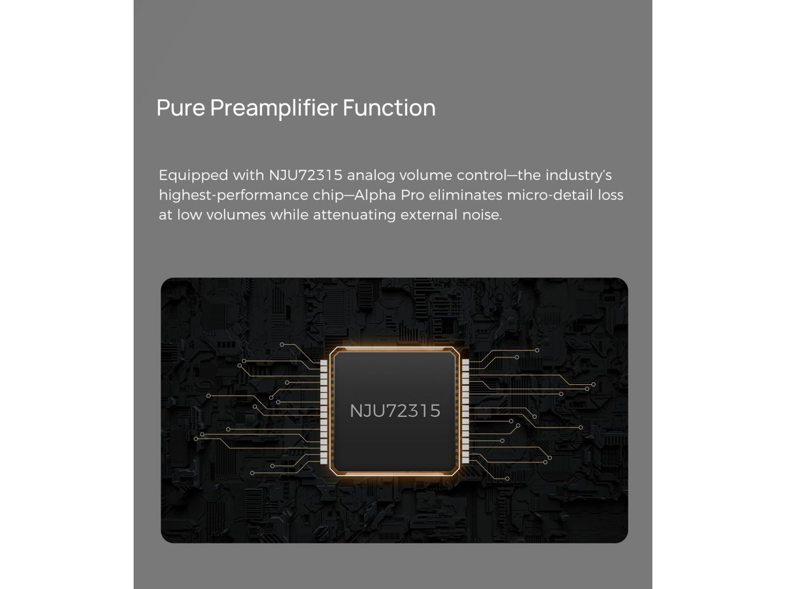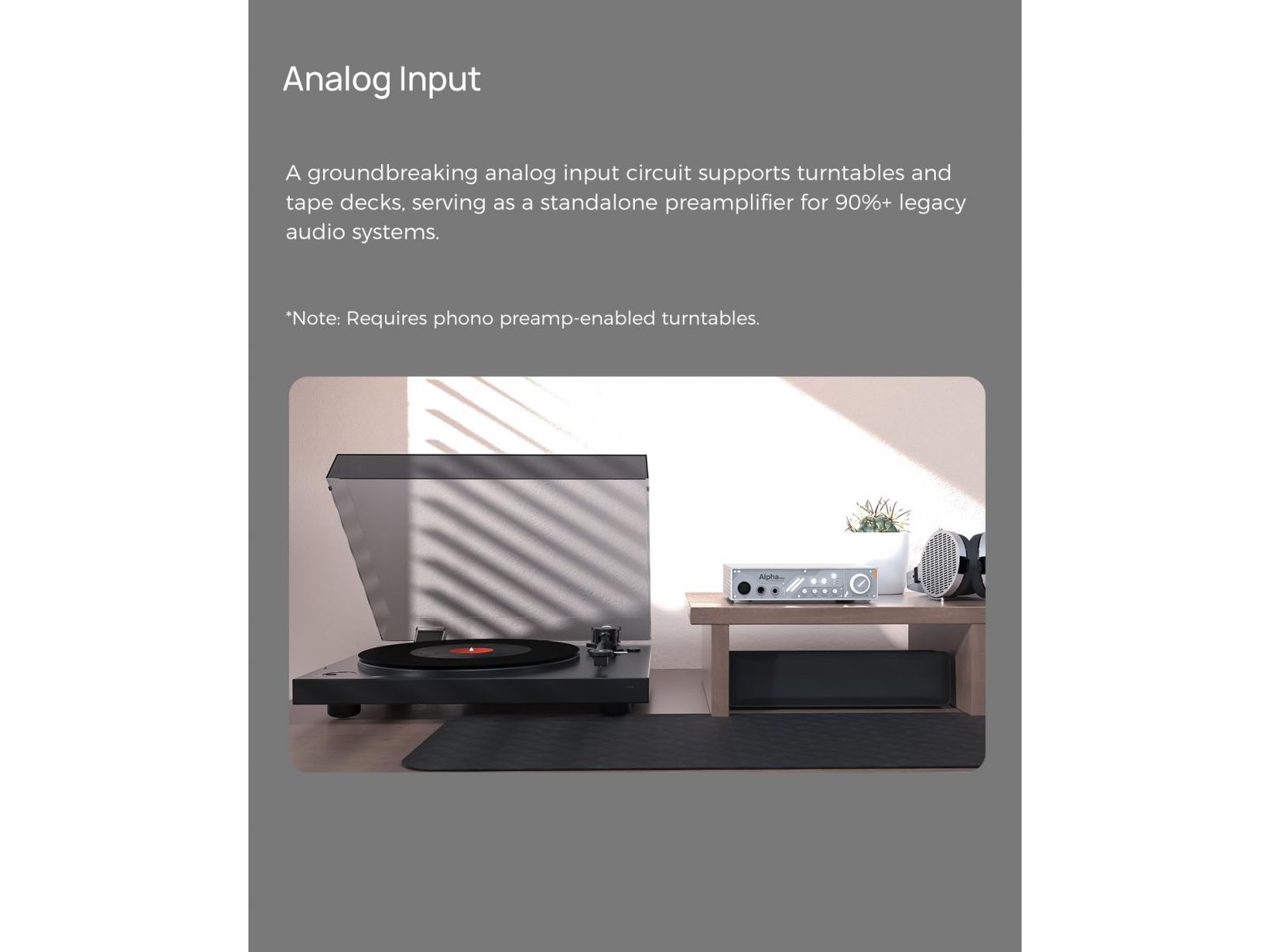 В отличие от большинства комбоустройств, DIGI-AESTH Alpha PRO оснащён настоящим аналоговым предусилителем, позволяющим использовать его с источниками типа виниловых проигрывателей или кассетных дек. Аналоговый вход напрямую подключается к усилителю, минуя цифро-аналоговую обработку.
