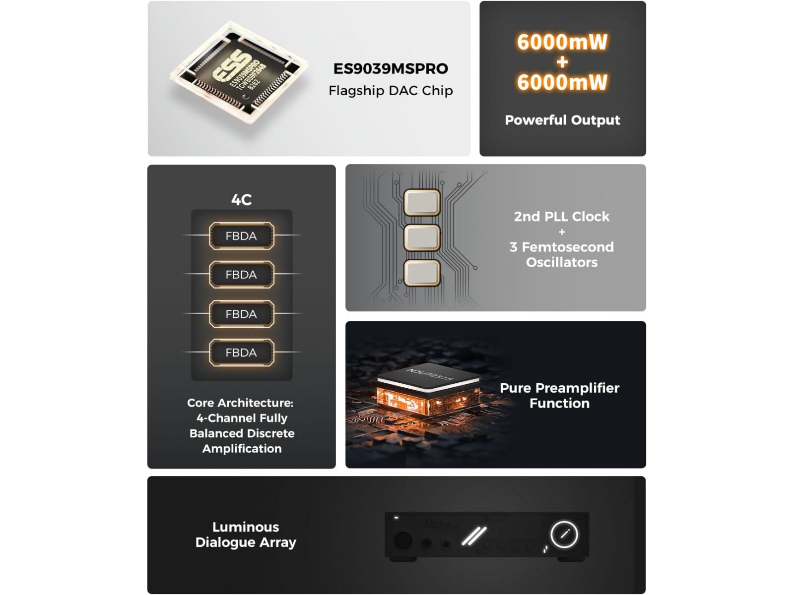 Сигнальный тракт построен по схеме SIGMA DAC с восемью дифференциальными потоками на канал, что снижает импеданс и улучшает передачу микродеталей. Усилитель построен на 32 транзисторах (по 8 на канал) и выдаёт до 6000 мВт на канал при 32 Ом, с выходным импедансом ниже 0.1 Ом и искажениями на уровне 0.0001%.