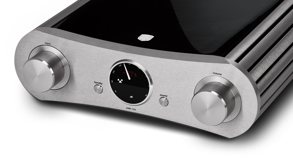 AMP-150 — чисто аналоговый усилитель с балансными и небалансными входами, пре-выходами, функцией Direct (для интеграции в home theater) и информативным аналоговым дисплеем в стиле "часов" для индикации громкости, источника и статуса.