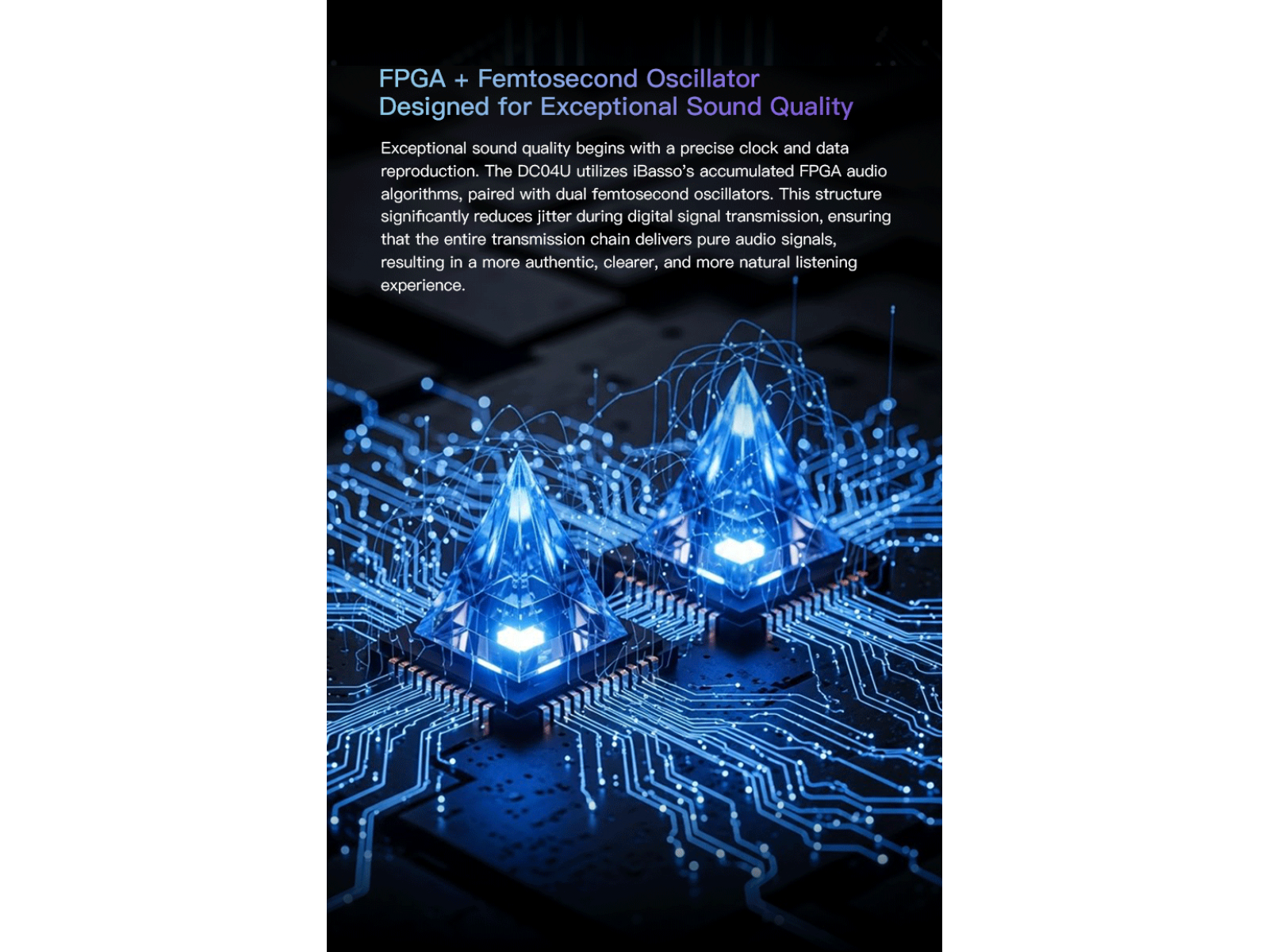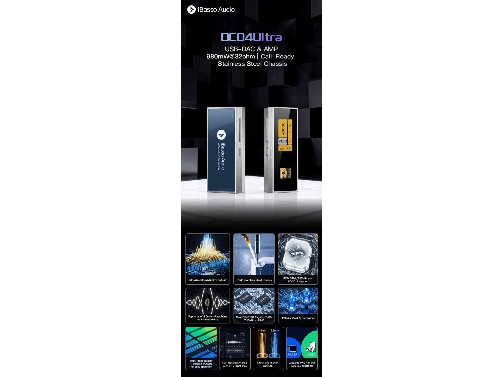 iBasso DC04 Ultra — портативный USB ЦАП/усилитель от китайской компании iBasso Audio, новая флагманская модель в серии DC с двумя чипами CS43198 в полностью балансной четырёхканальной схеме, FPGA-технологией и фемтосекундным осциллятором для минимального джиттера.