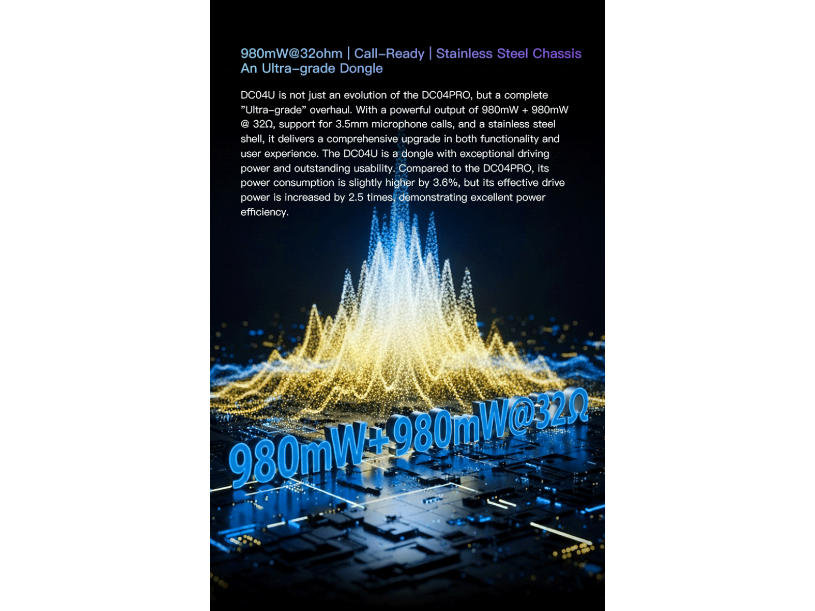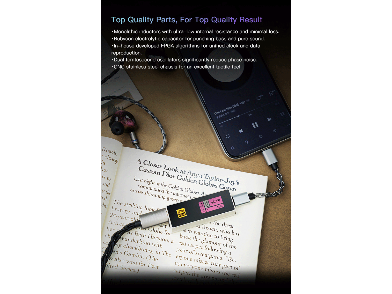 Устройство поддерживает высокое разрешение (PCM до 768 кГц, DSD512 нативно), технологию DRE для устранения искажений на 0 дБ, а также точную регулировку напряжения усилителя. Выходы — балансный 4,4 мм и небалансный 3,5 мм, с поддержкой микрофона. Мощность впечатляющая: до 980 мВт + 980 мВт на 32 Ом (по некоторым данным до 945 мВт на канал), что позволяет легко раскачивать не только внутриканальные мониторы, но и полноразмерные наушники без внешнего питания.