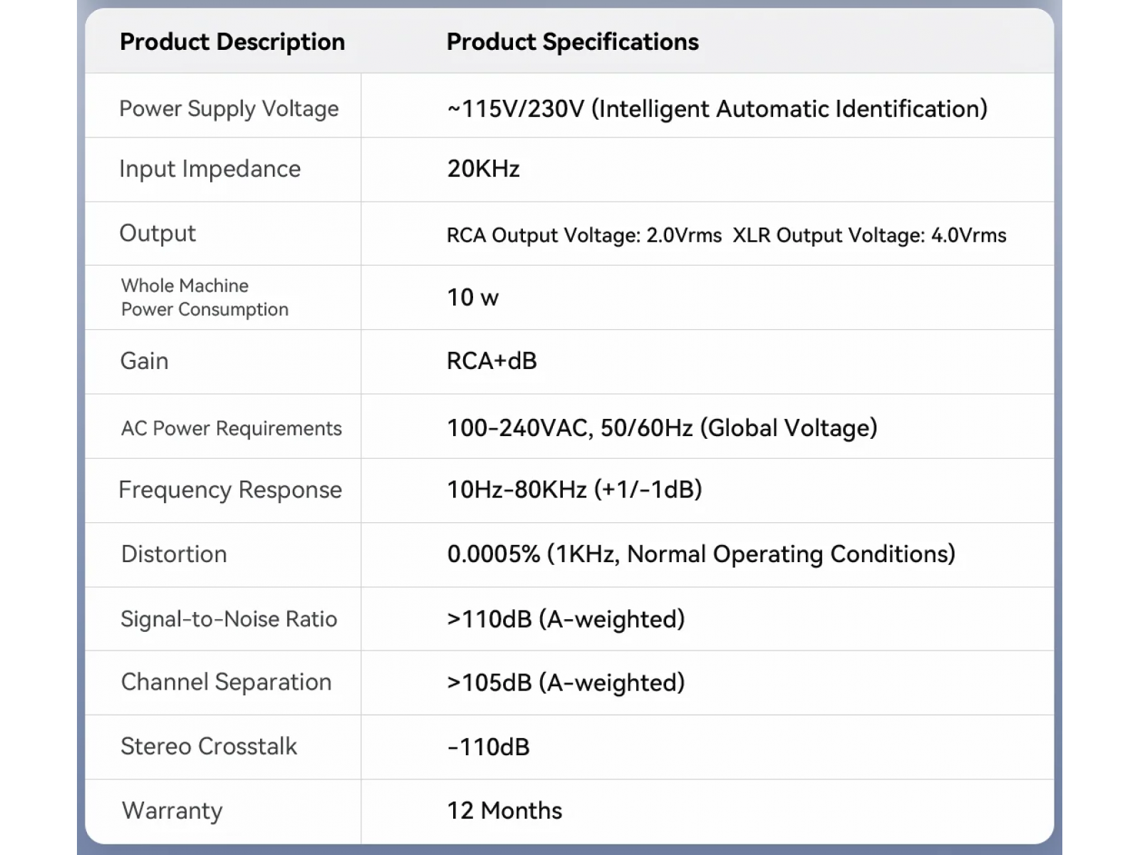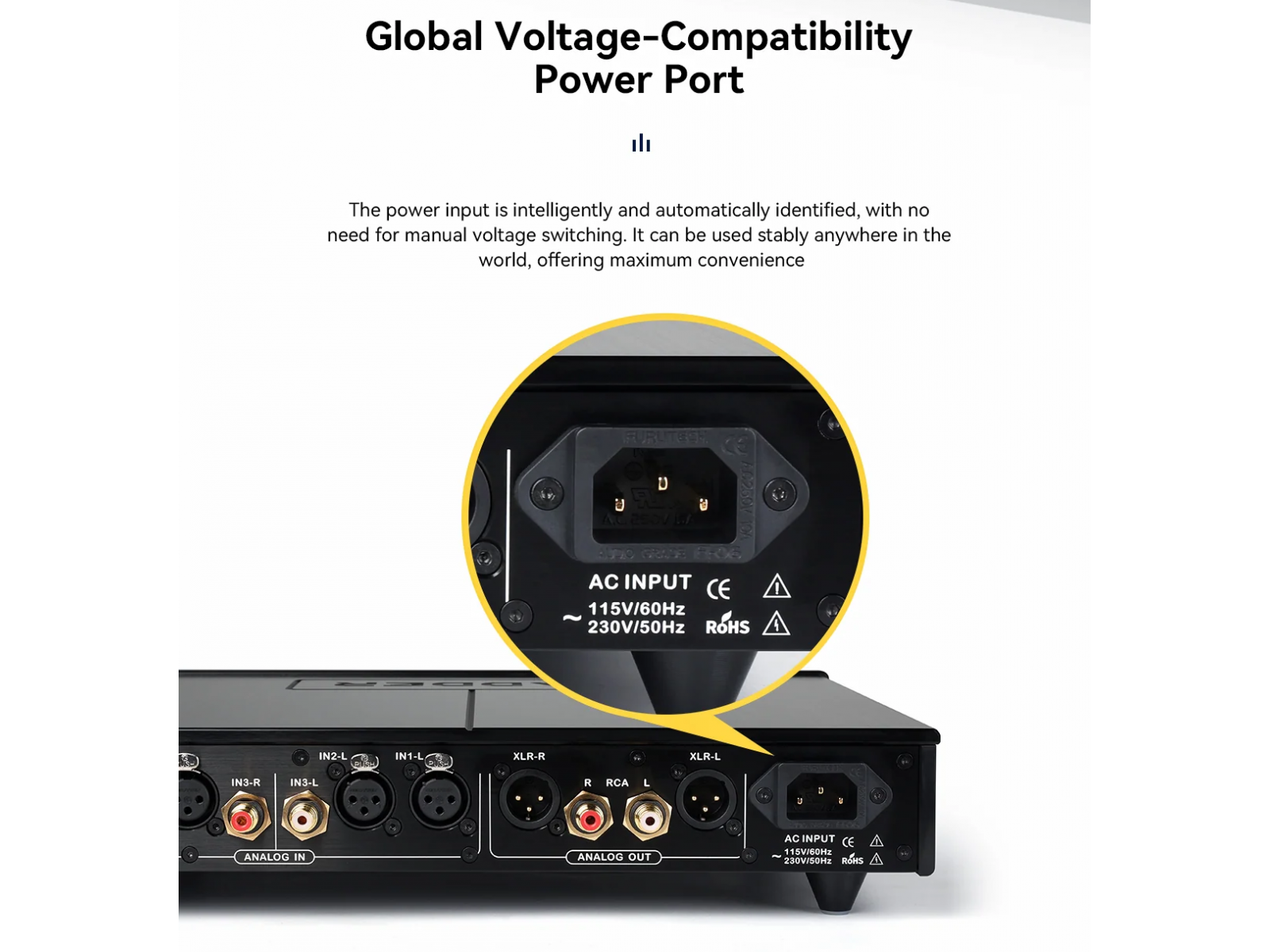 Корпус выполнен из алюминиевого сплава с анодированным покрытием и шлифованной фактурой. На передней панели расположены два симметричных энкодера — для выбора источника и регулировки громкости, а также информативный дисплей. На задней панели предусмотрены 2 балансных входа XLR, один вход RCA, а также балансный и небалансный выход. Устройство совместимо с сетями 115/230 В и подходит для глобального использования.