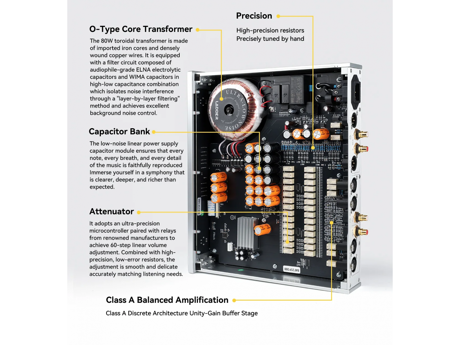 Модель создана на базе 80-ваттного тороидального трансформатора с низким уровнем шума и фильтрацией на конденсаторах ELNA и WIMA. Используется дискретный буферный каскад с единичным усилением, обеспечивающий точную передачу сигнала без окрашивания. Регулировка громкости реализована через микроконтроллер и релейный аттенюатор с 60 шагами и подобранными по точности резисторами, что исключает перекос каналов и обеспечивает стабильность на низких уровнях.