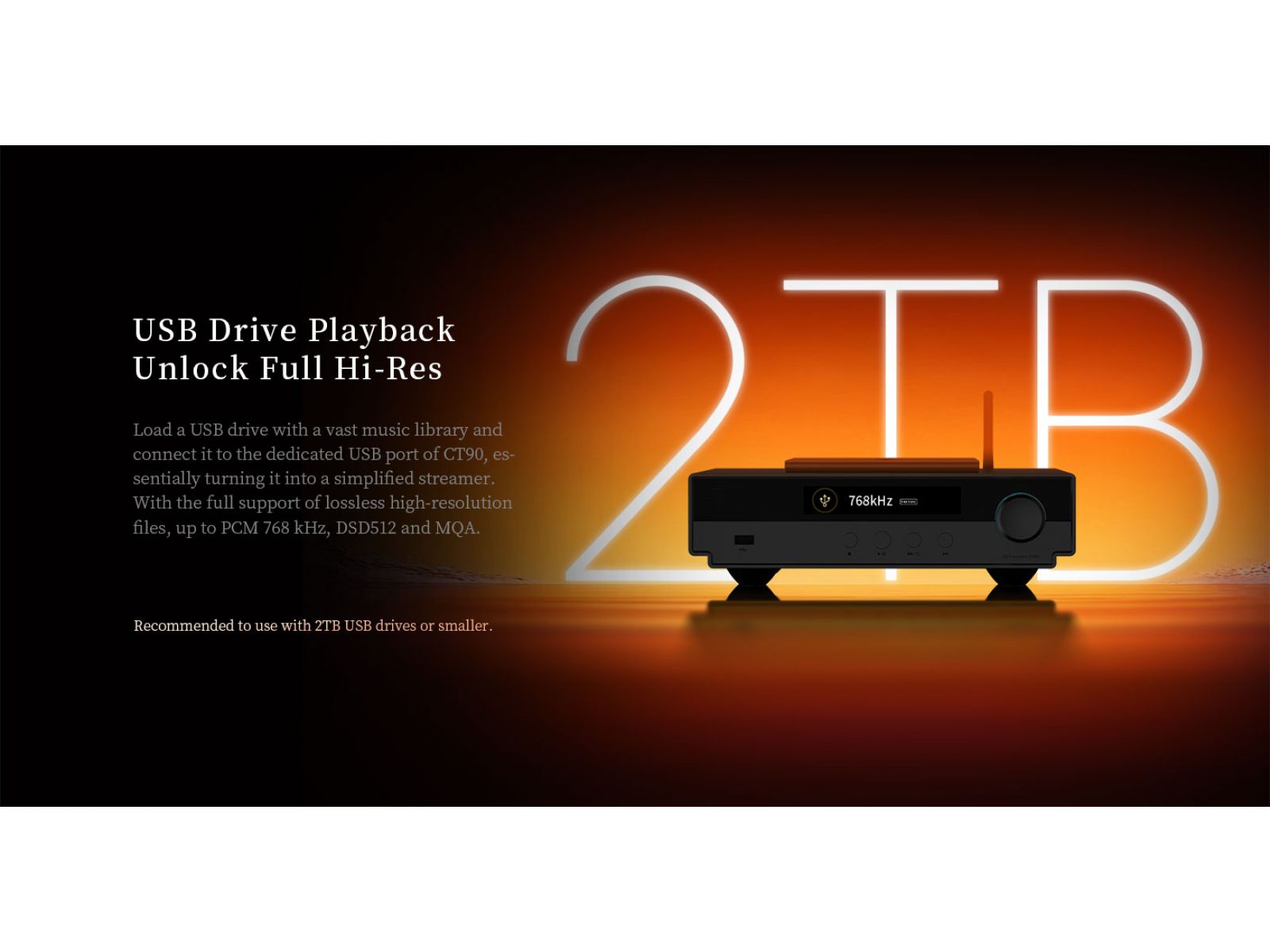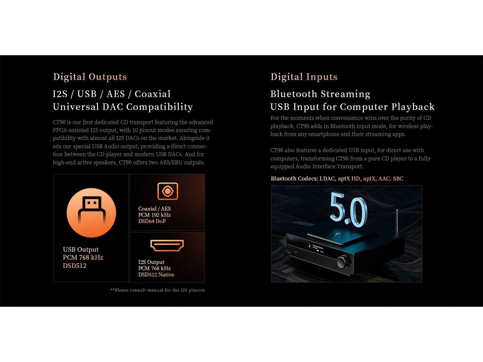 CT90 может использоваться не только как CD-транспорт, но и как цифровой источник для файлов и внешних устройств. Поддерживается воспроизведение Hi-Res файлов с USB-накопителей с управлением через приложение Eddict Player, а также работа в режиме USB-транспорта при подключении к компьютеру. Встроенный Bluetooth-приемник позволяет принимать сигнал со смартфонов и планшетов с поддержкой кодеков LDAC, aptX HD, aptX, AAC и SBC. Wi-Fi модуль отсутствует.
