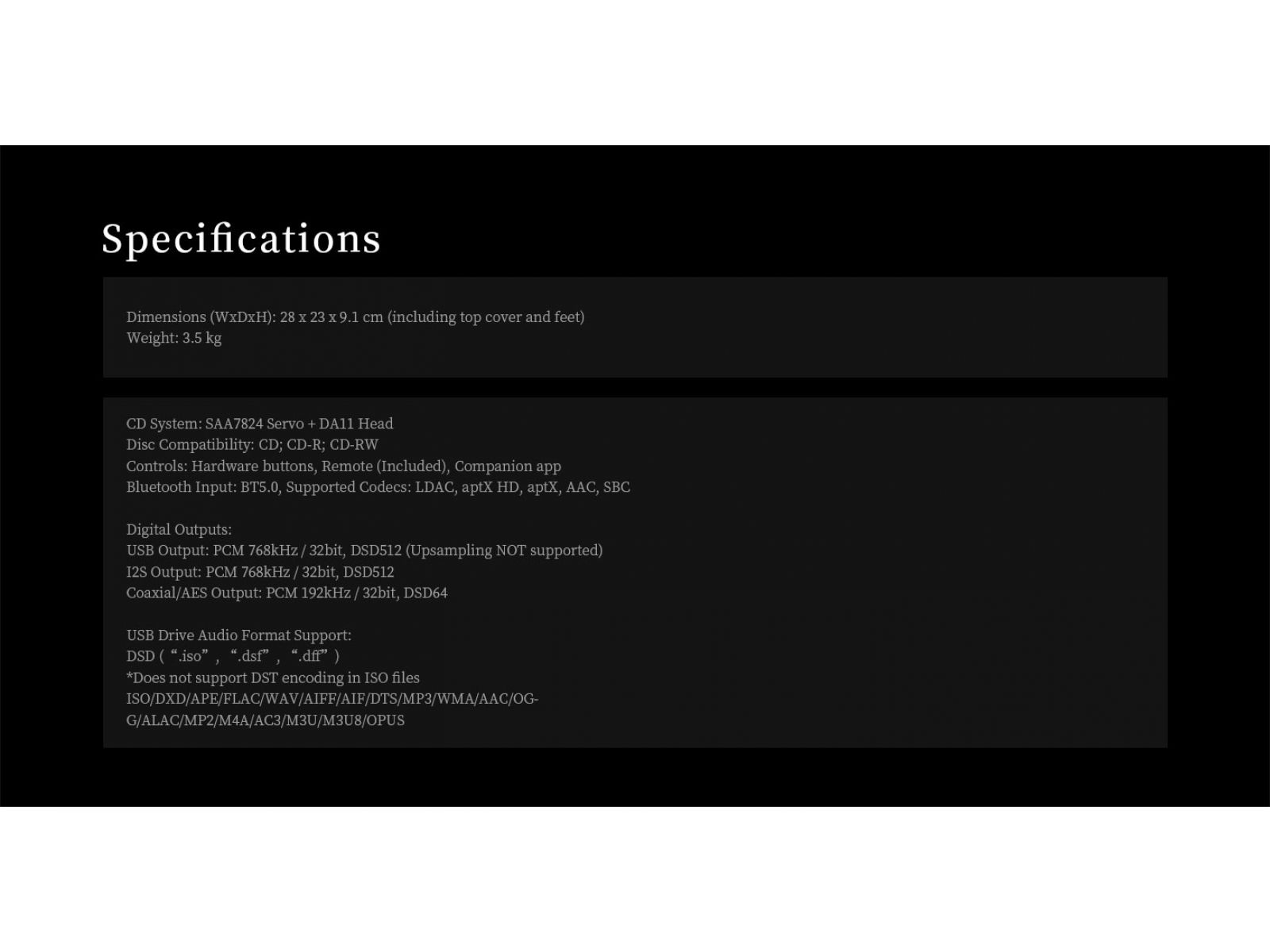 | Поддерживаемые форматы | PCM, DSD, DXD, MQA, ISO, FLAC, WAV, AIFF, APE, AAC, MP3, OGG, ALAC, OPUS, M3U |