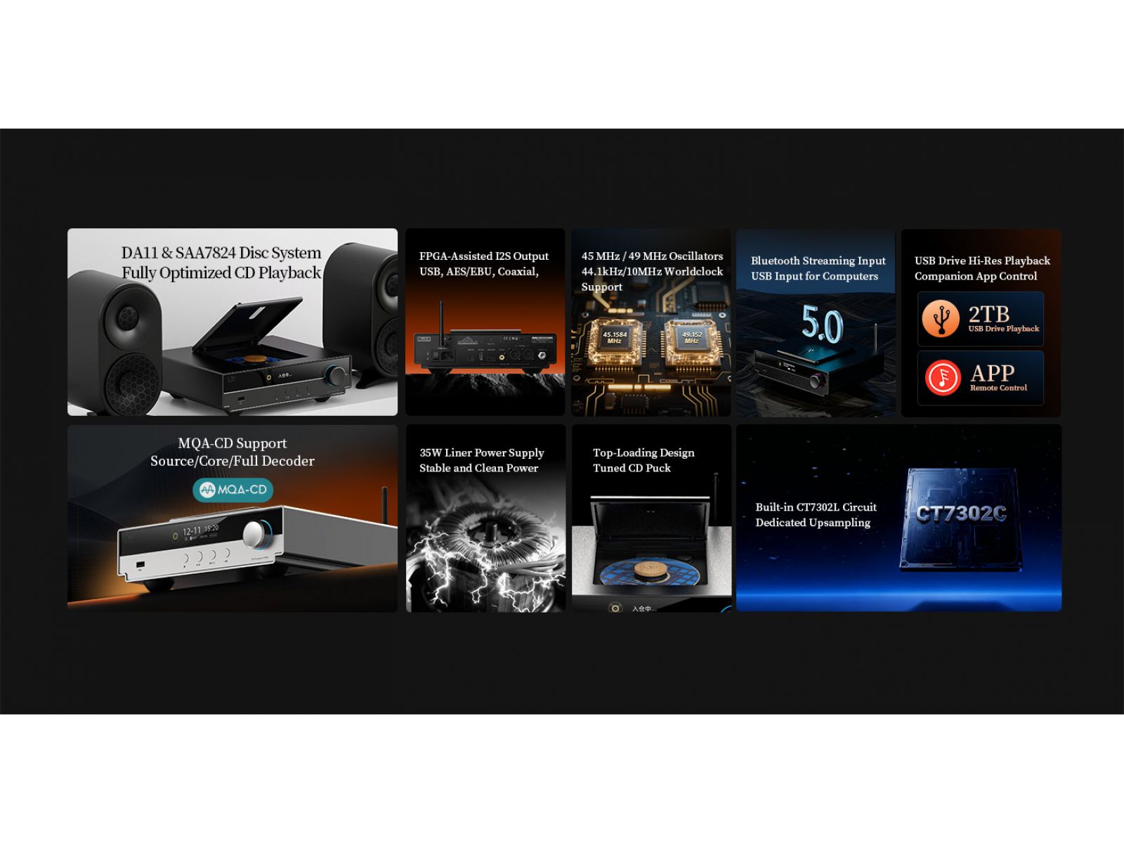 Для цифровых подключений предусмотрен широкий набор выходов, включая I2S с FPGA-логикой и десятью режимами распиновки для совместимости с ЦАП разных производителей, коаксиальный SPDIF и два выхода AES/EBU. Отдельный USB Audio выход используется как фирменный цифровой интерфейс Shanling. В устройстве применены два высокоточных тактовых генератора 45 и 49 МГц, а также вход для внешнего мастер-клока с поддержкой 44.1 кГц и 10 МГц. Встроенная схема апсемплинга позволяет выполнять преобразование All-to-PCM или All-to-DSD для I2S и AES/Coax выходов, но не работает через USB Audio. Питание реализовано на линейном блоке с трансформатором мощностью 35 Вт.