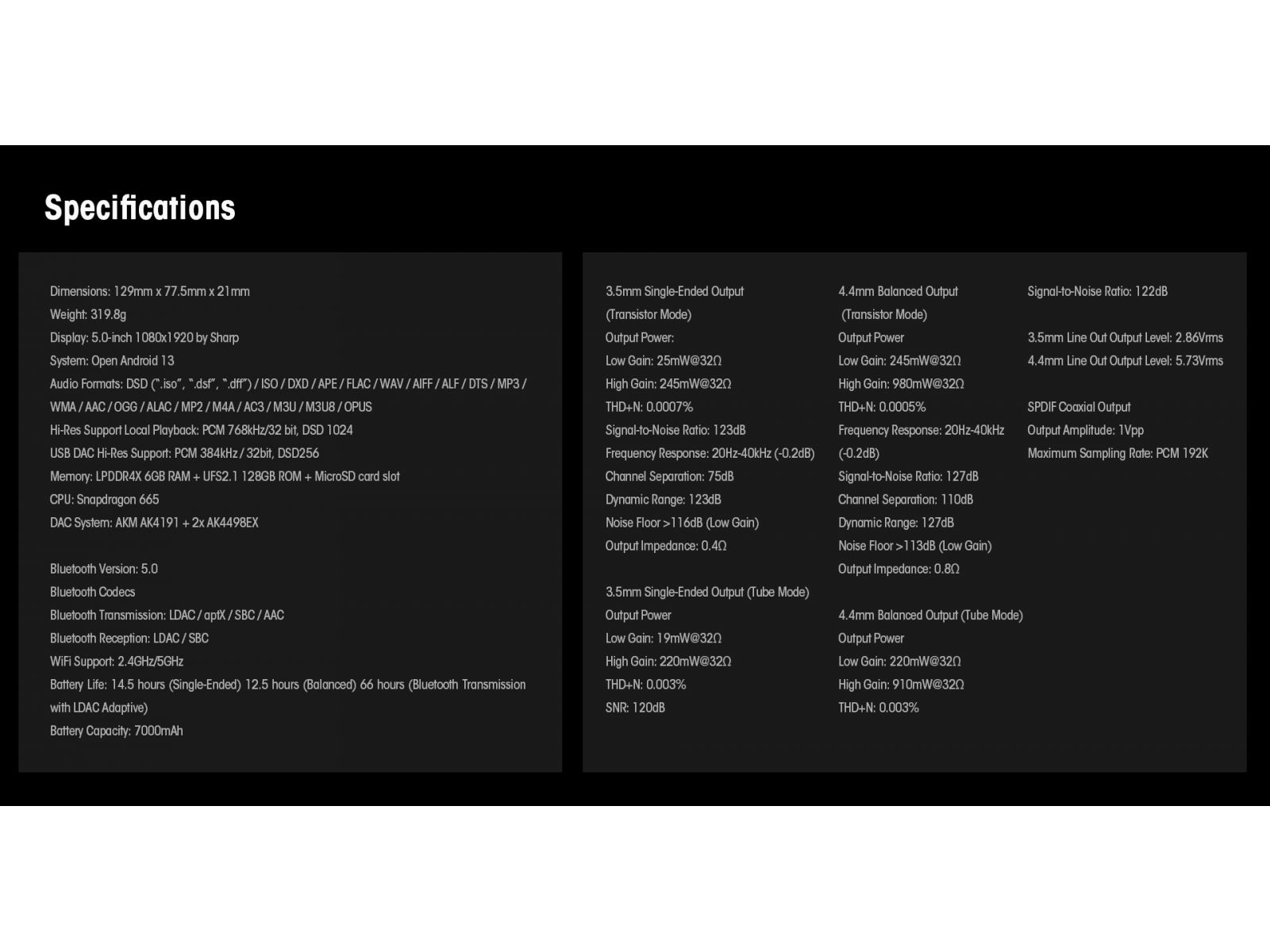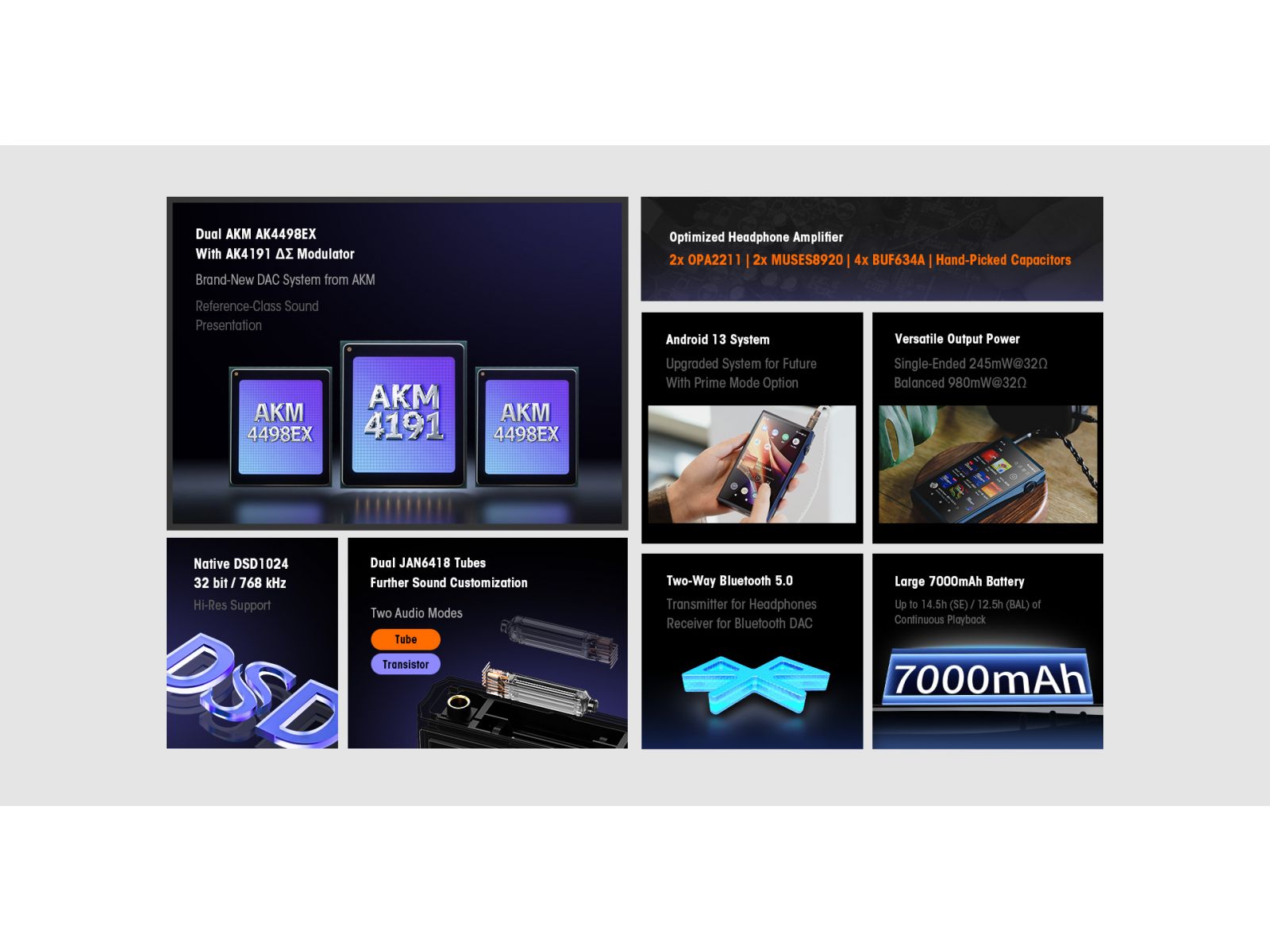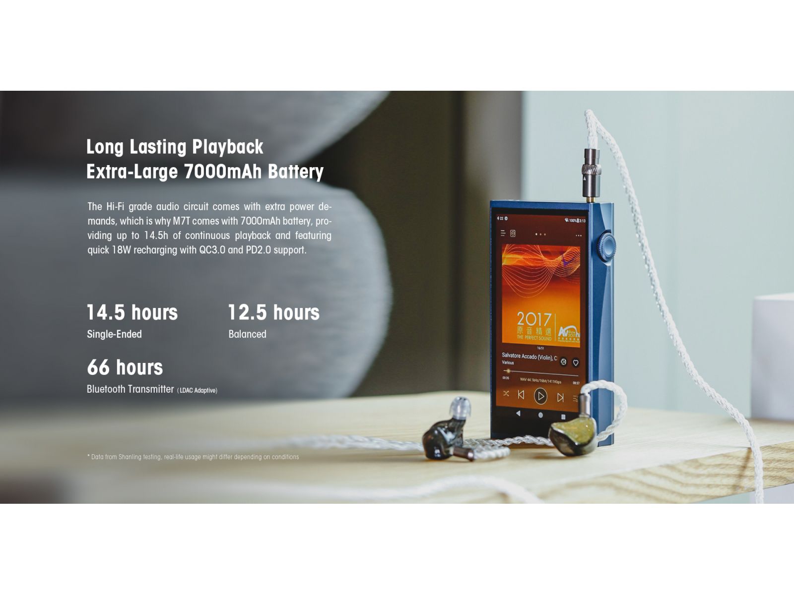 Питание обеспечивает аккумулятор ёмкостью 7000 мАч, которого хватает до 14,5 часов в режиме обычного выхода, до 12,5 часов на балансном и до 66 часов при использовании Bluetooth. Поддержка быстрой зарядки QC3.0 и PD2.0 делает восстановление энергии быстрым и удобным.