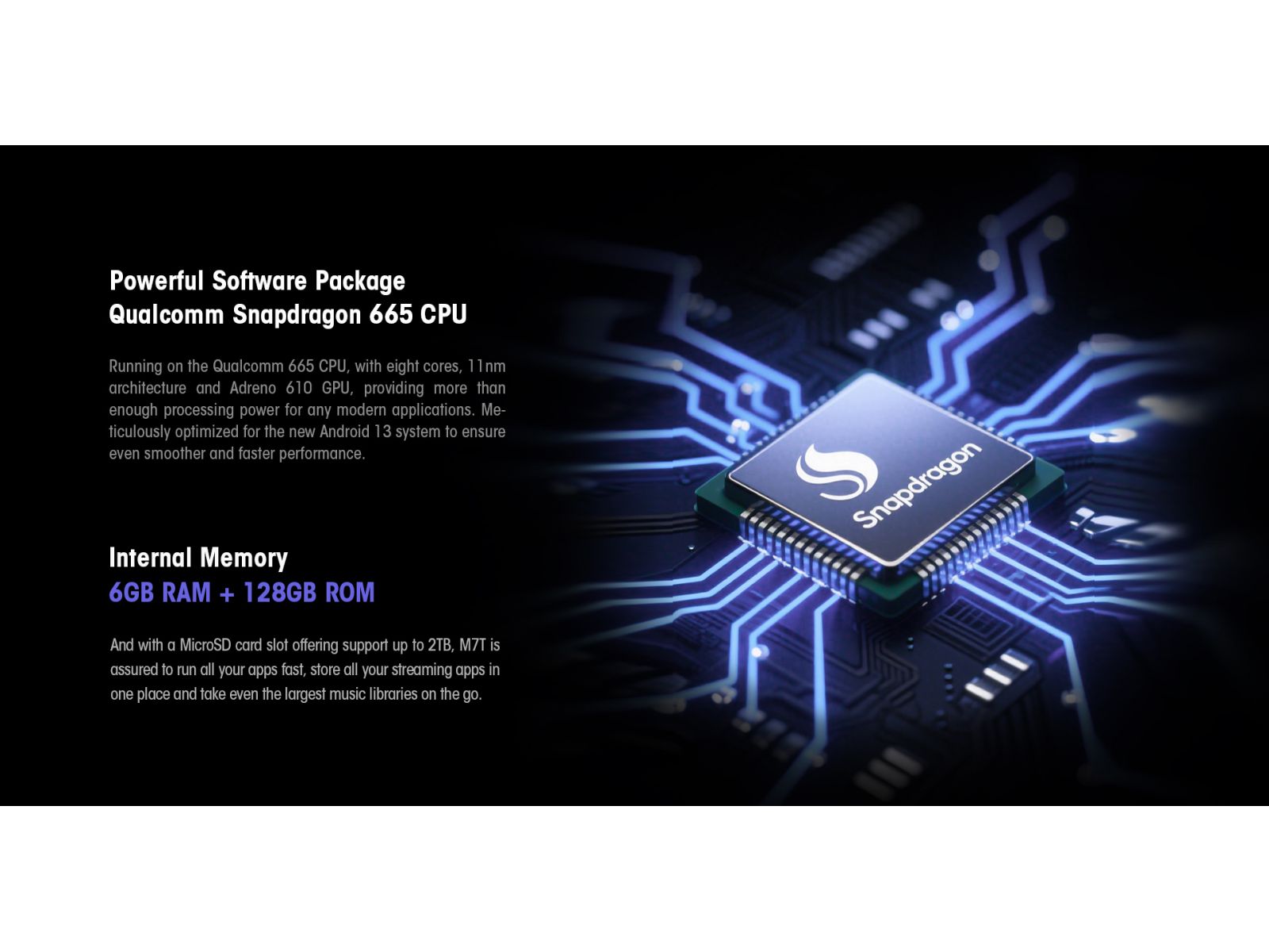 За работу системы отвечает Snapdragon 665 и Android 13. Поддержка технологии AGLO (Android Global Lossless Output) гарантирует обход ограничений встроенного SRC и воспроизведение в режиме bit-perfect. Аппаратная часть включает 6 ГБ оперативной памяти, 128 ГБ встроенной и слот для карт microSD.
