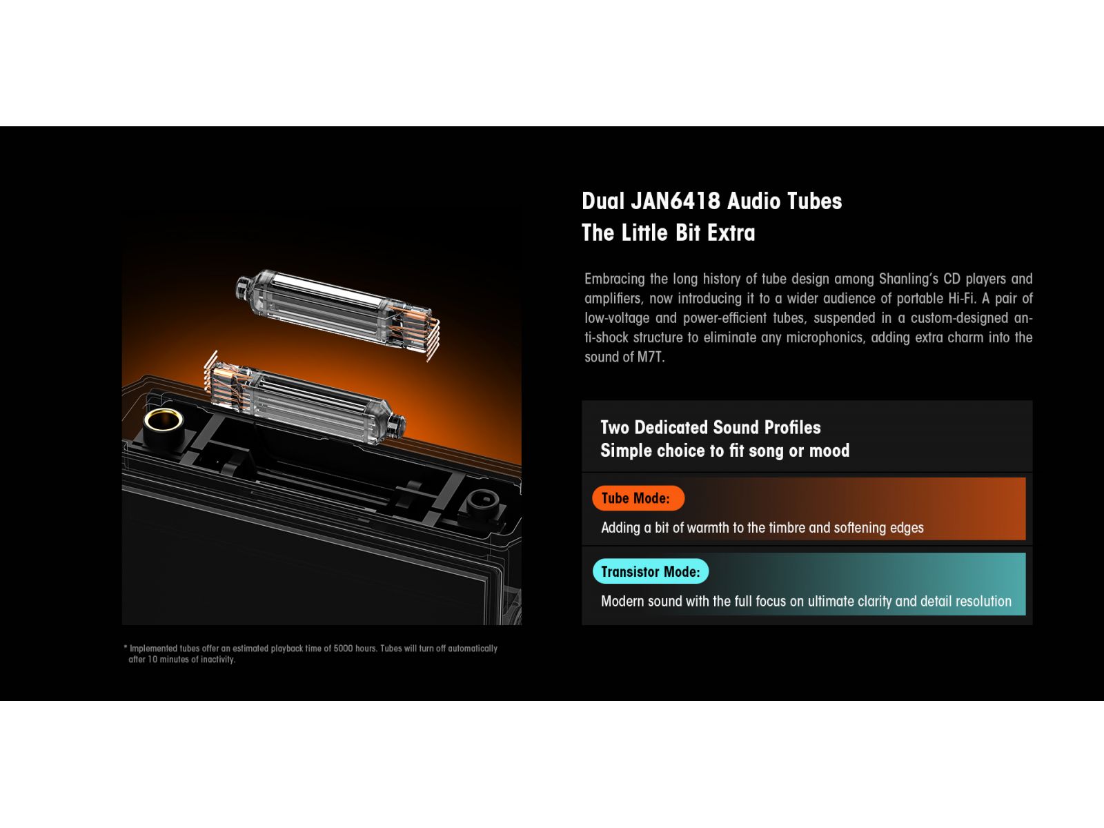 Shanling M7T – новый портативный плеер, который задаёт ориентир в среднем сегменте Hi-Fi. Устройство сочетает в себе флагманскую архитектуру ЦАП AKM (AK4191 вместе с двумя AK4498EX), двойные вакуумные лампы JAN6418 и тщательно оптимизированный усилительный каскад, обеспечивая звучание высокого уровня. При этом плеер работает на Android 13, сохраняя баланс между технической мощью и удобством современного устройства.