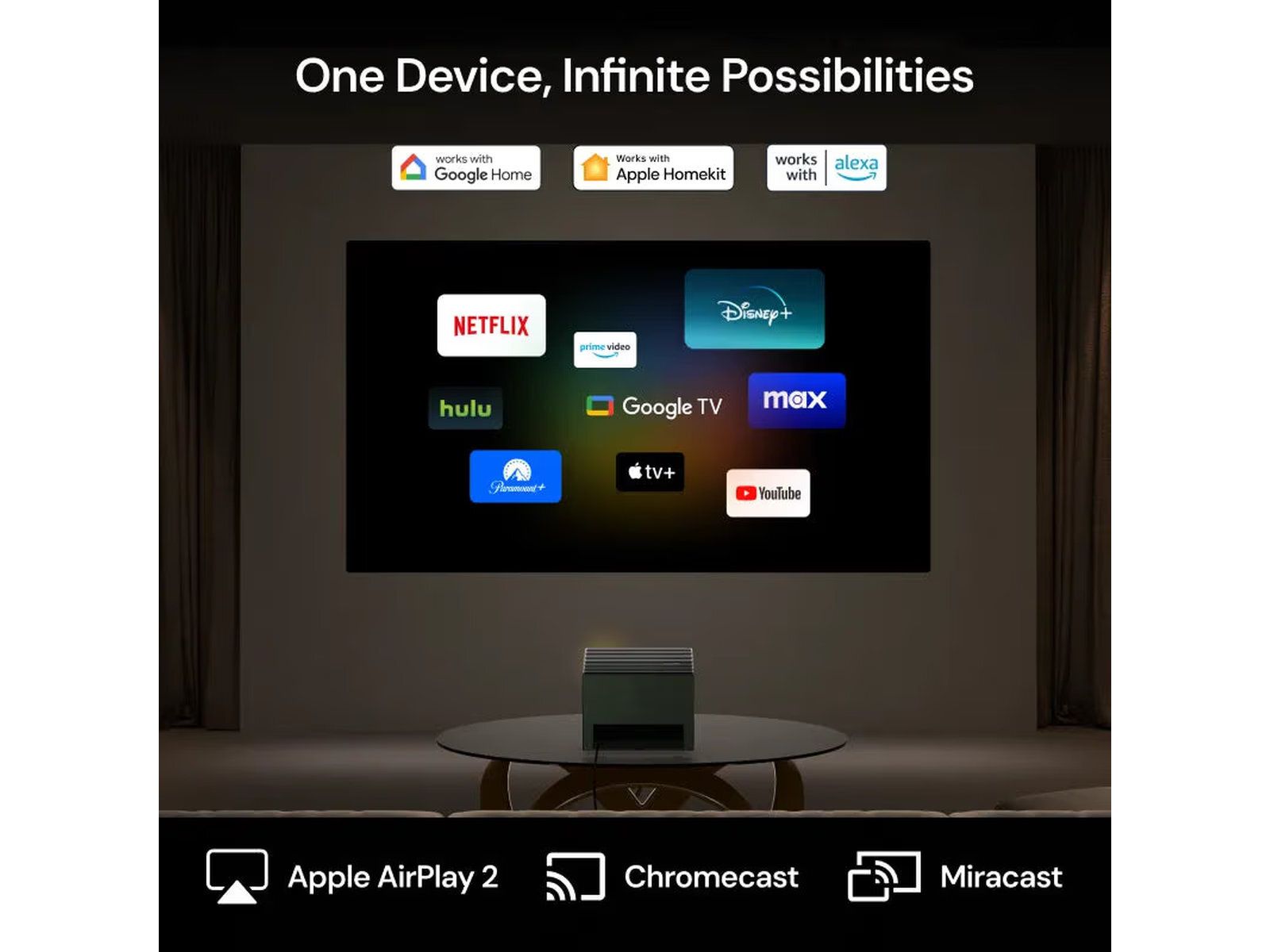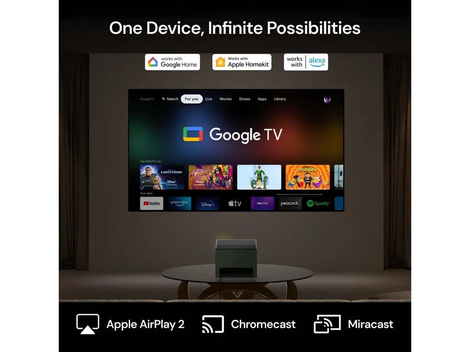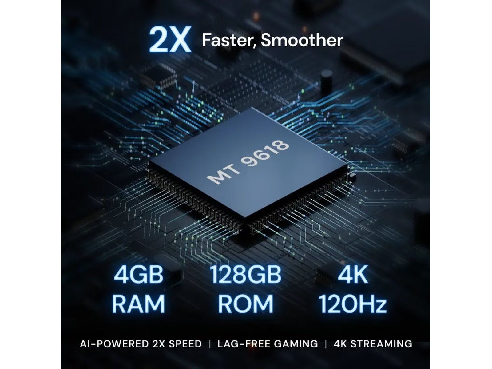 Платформа — Google TV на мощном чипе MT9618 с 4 ГБ RAM и 128 ГБ памяти для быстрого стриминга (Netflix, Disney+ и др.), поддержки AirPlay 2, Chromecast, Miracast и интеграции с умным домом (Google Home, Alexa, Apple HomeKit).