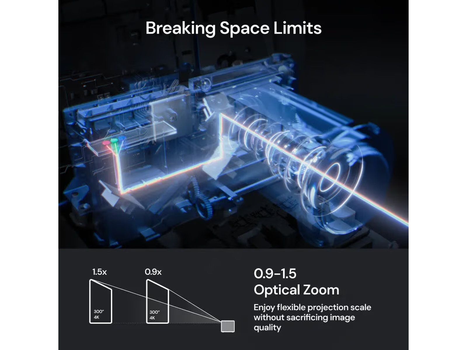 Оптический зум 0.9–1.5:1, автоматическая фокусировка, коррекция трапеции и обход препятствий. Встроенные динамики 2×12 Вт с DTS Virtual:X, плюс eARC для внешней аудиосистемы.